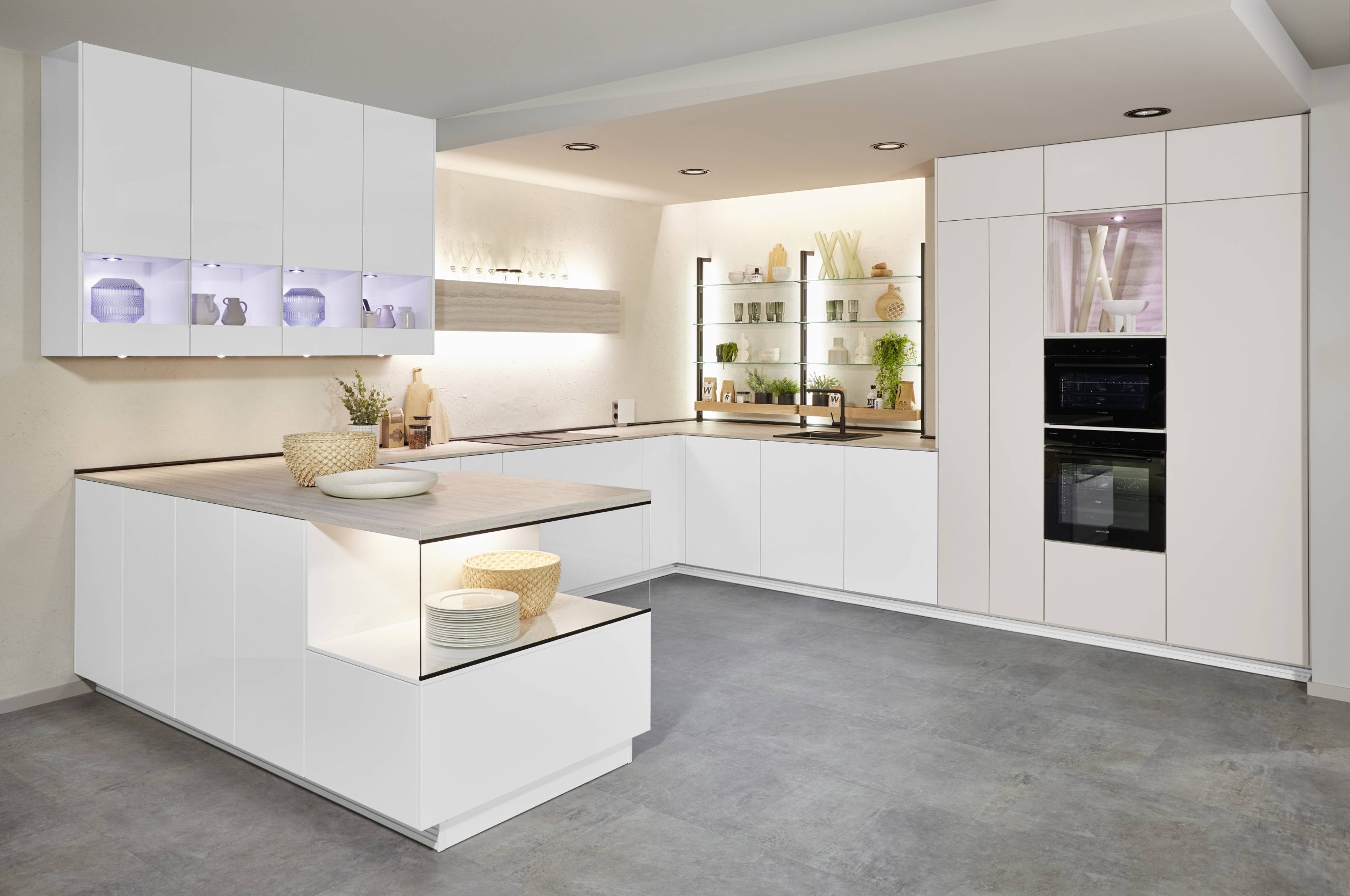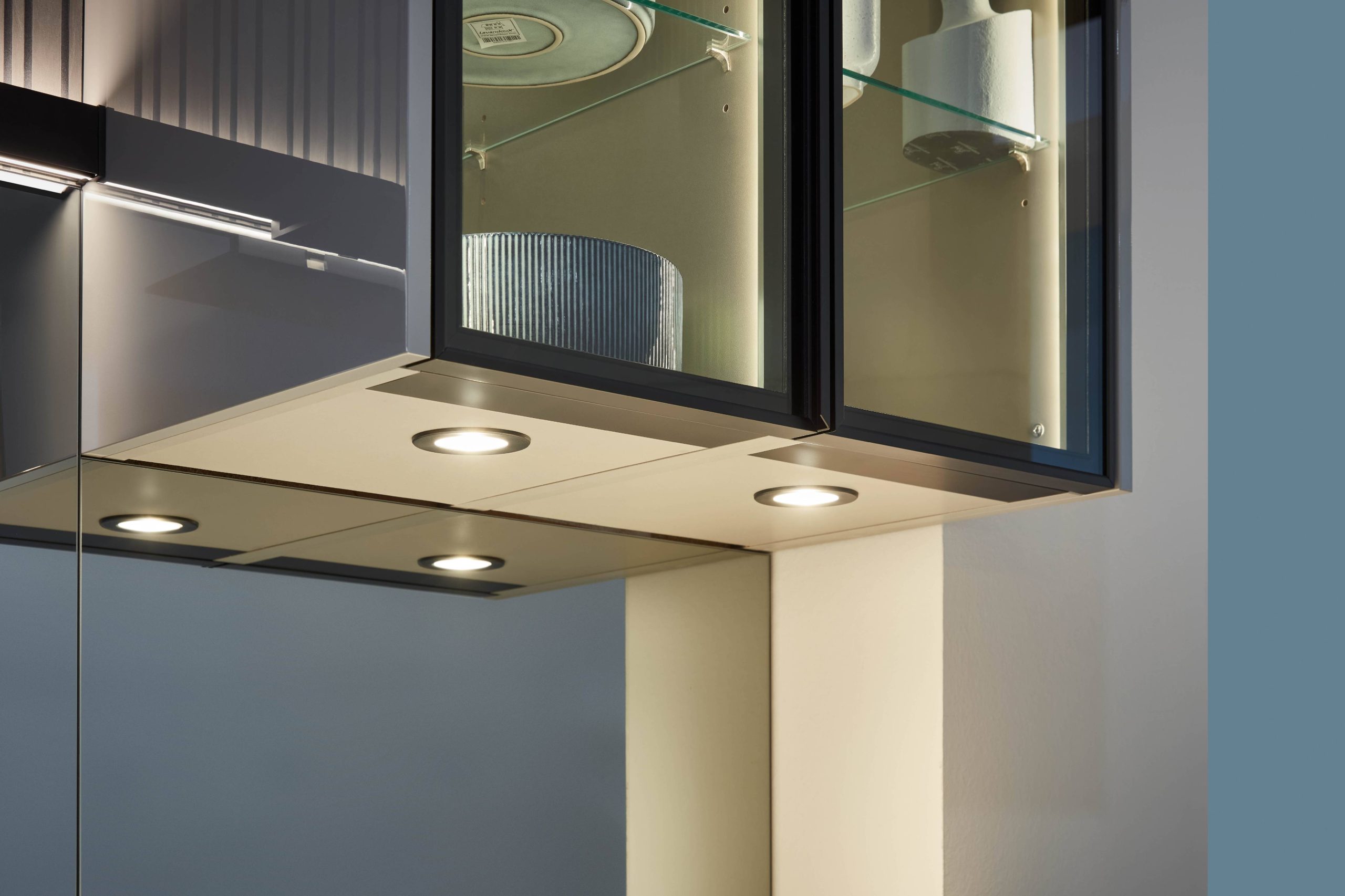 Vitrinekben, nyitott polcokon, lábazatban vagy rejtett felületeken jelenik meg. Nem a főzéshez kell, hanem ahhoz, hogy a konyha este is kellemes, otthonos tér maradjon.