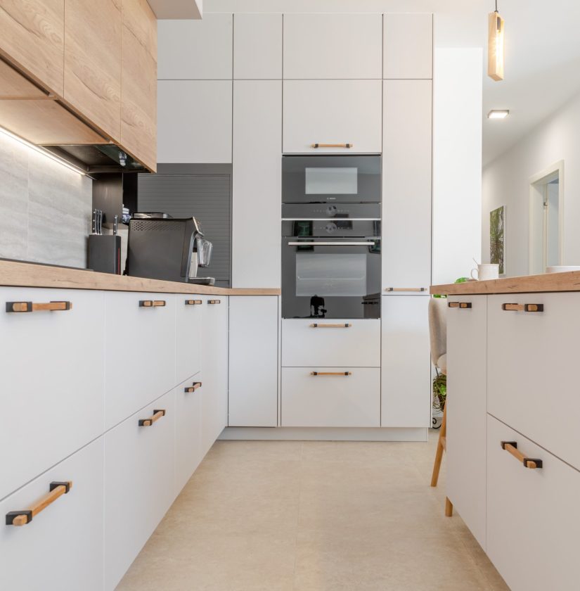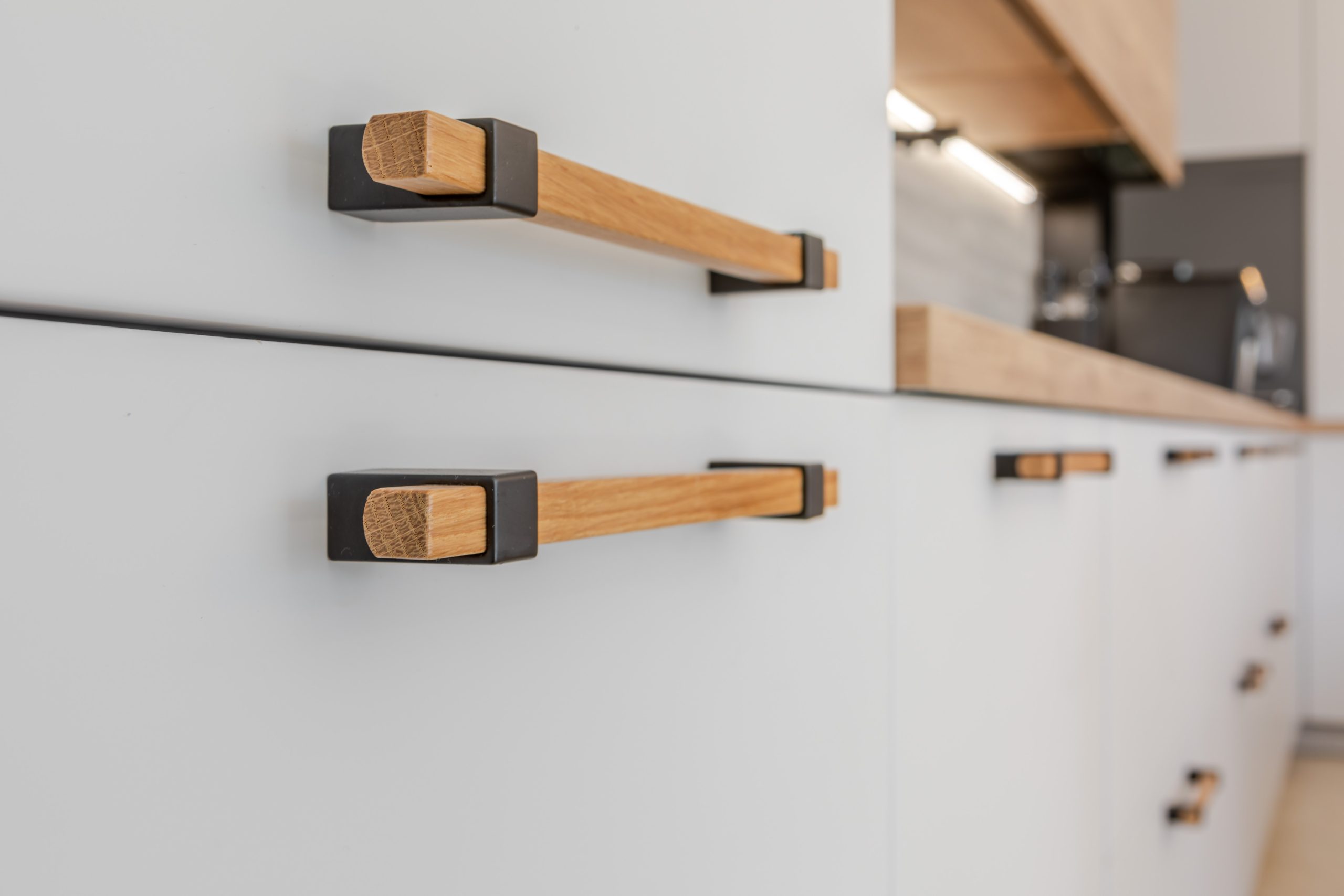Ezt a selyemfényű, hangulatos konyhát a tölgyfa fogantyúi teszik egyedivé.
