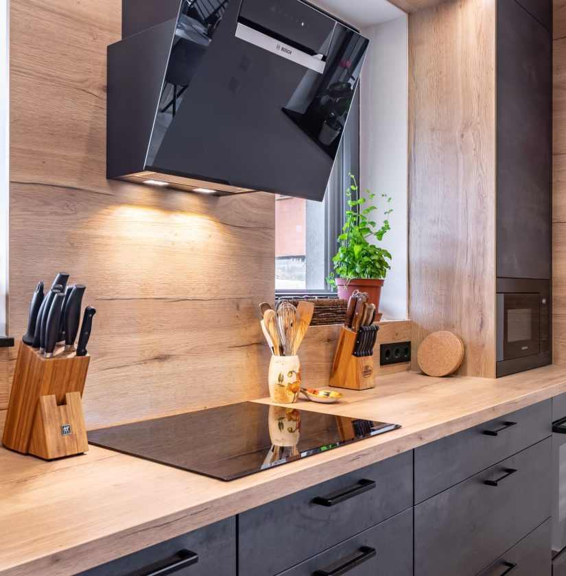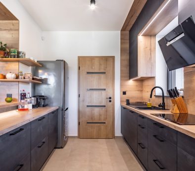 Ebben a konyhában a textúrált minta és a faerezetes kiegészítők ellensúlyozzák a sötétebb árnyalatot.