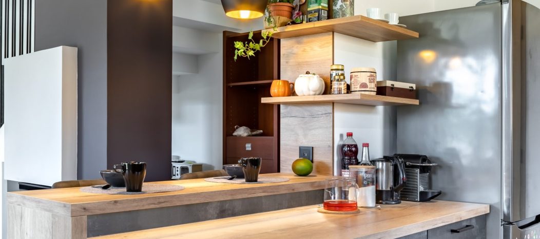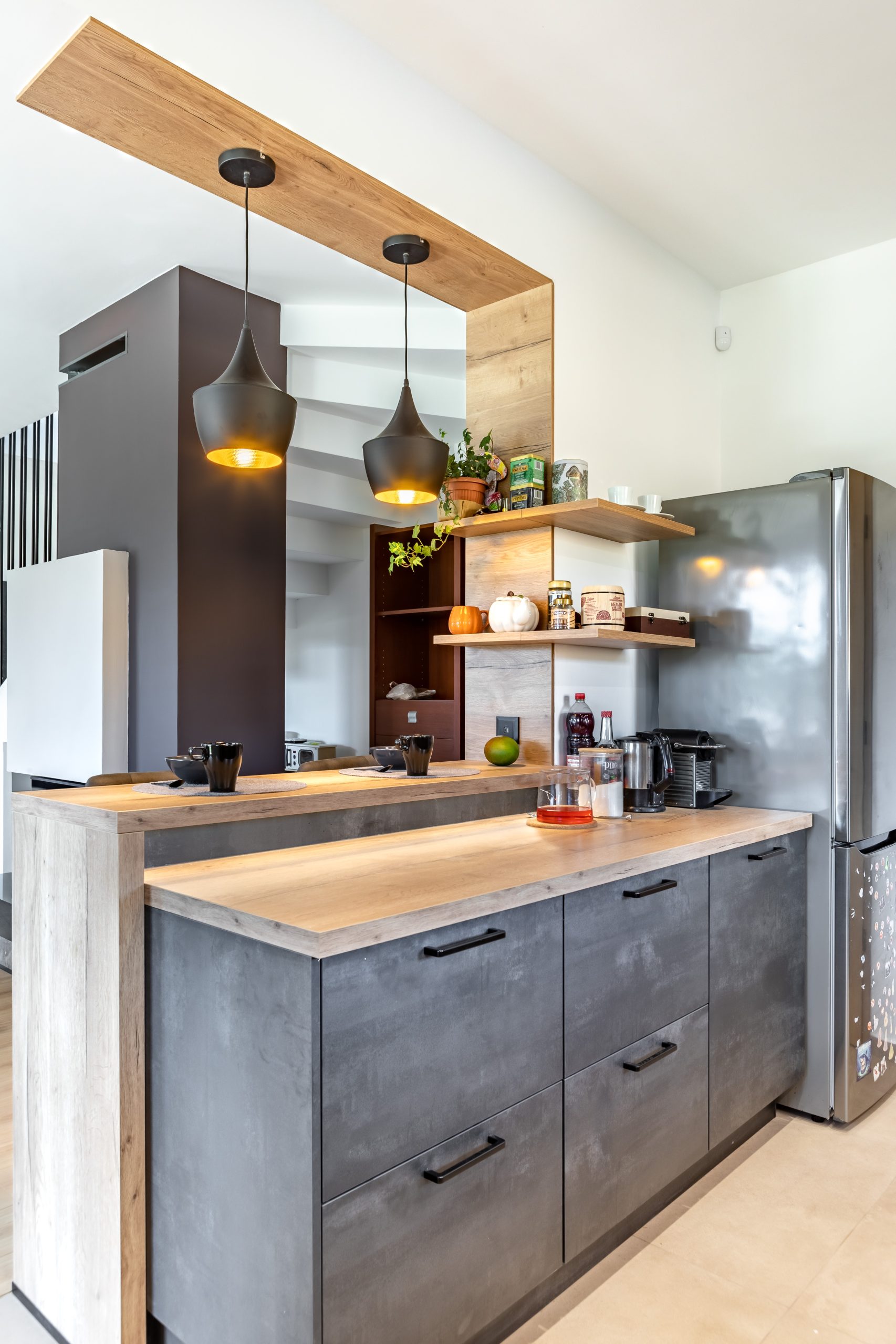 | Különleges megoldások: | Bárpult a közös reggelihez Nyitott polcos részek a légies, mégis okos helykihasználáshoz Plafon burkolat keretezés az egységes látványért |