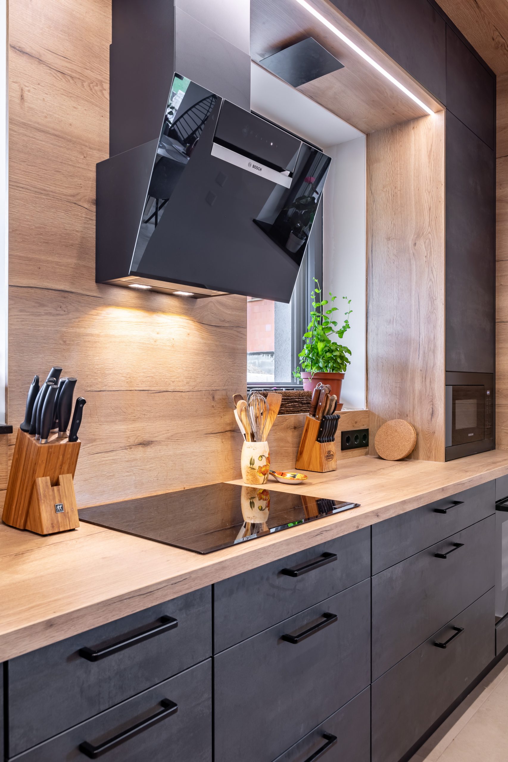 Így a végeredmény egy fénnyel teli, mégis vagány konyha lett.